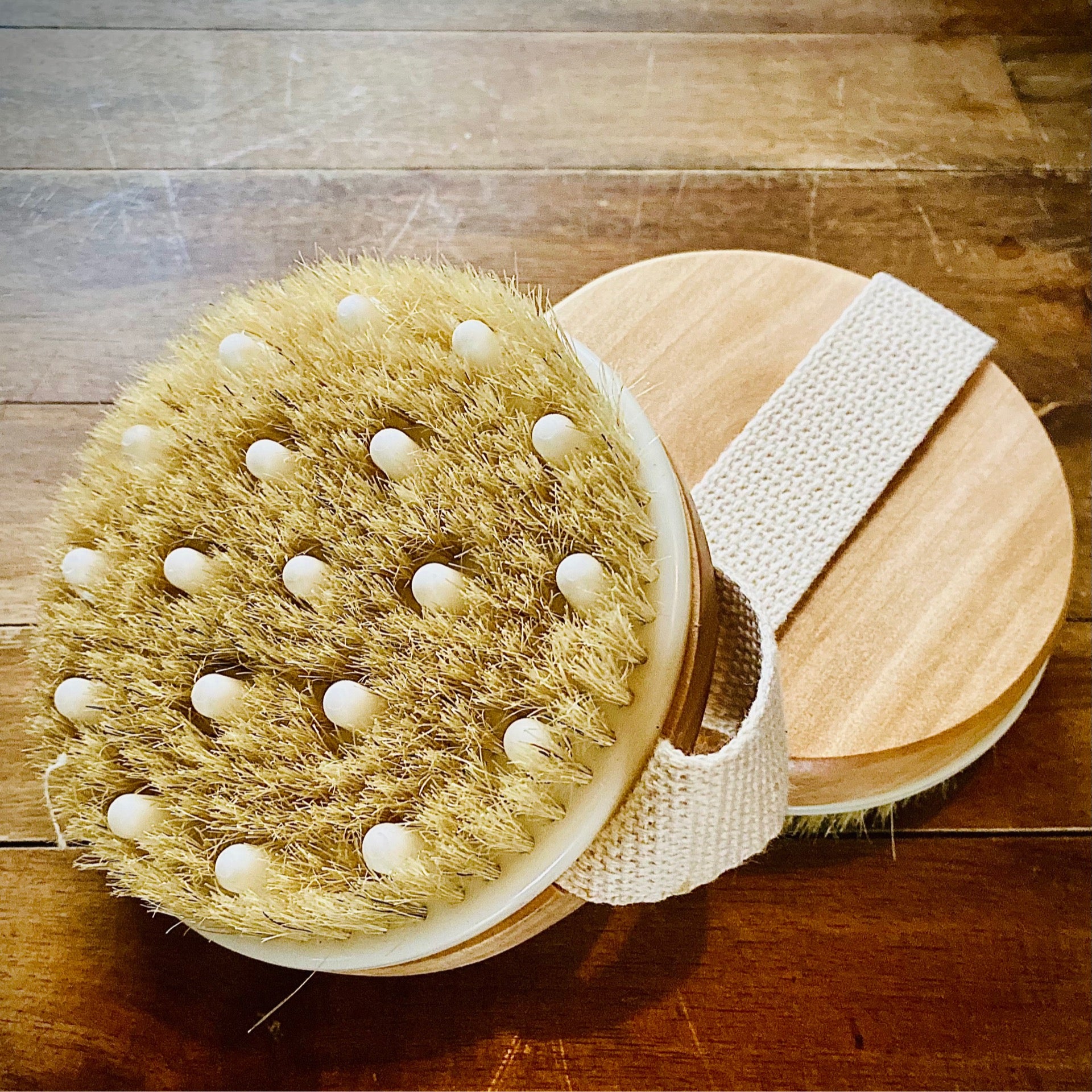 Large round wooden dry brush with natural bristles and a strap for ease of use! These pair perfectly with my organic cbd body oils! Dry brushing is an Ayurvedic self care technique that stimulates lymph flow, immunity, improves skin tone and exfoliates!