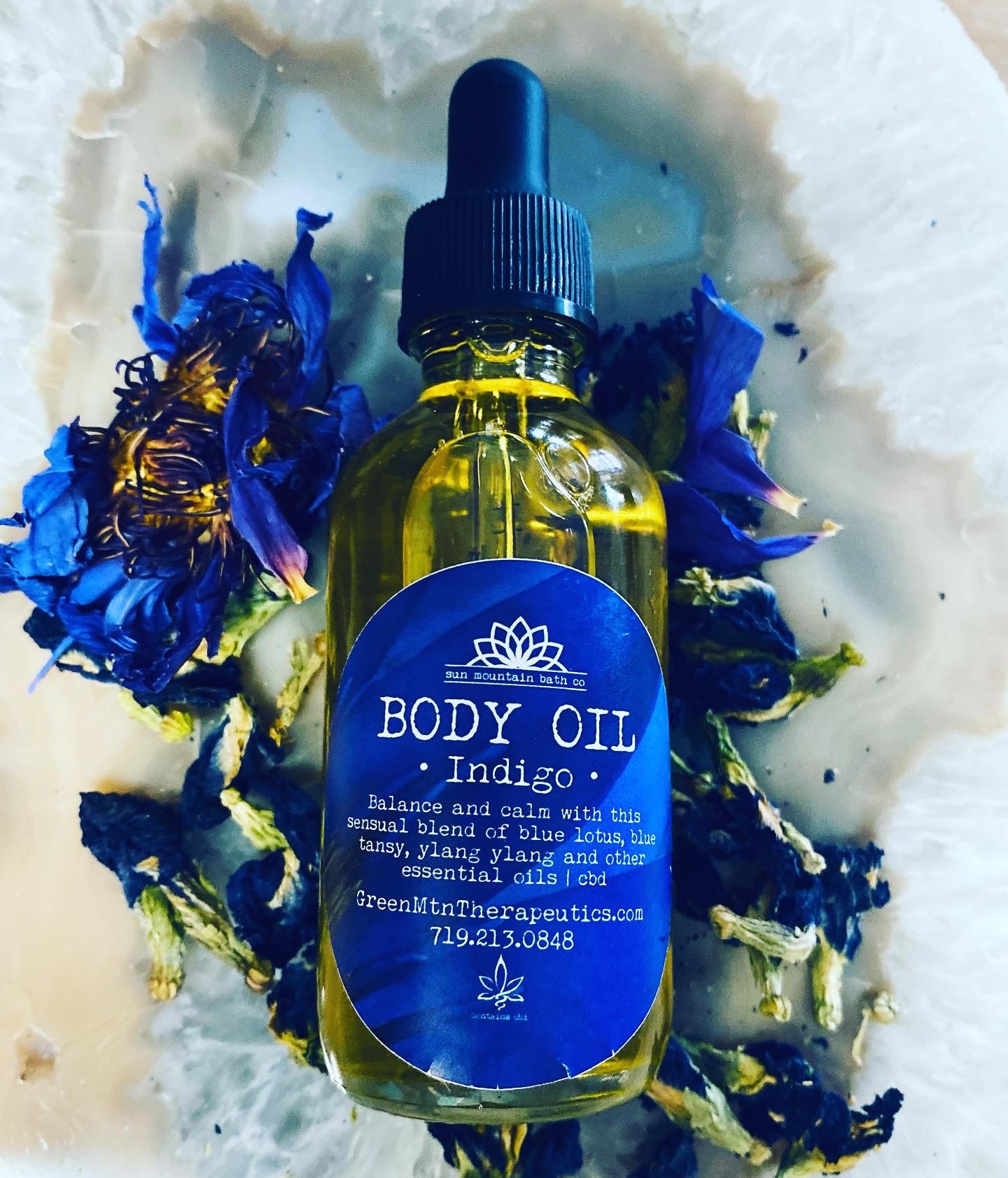 Indulge in the luxurious benefits of Indigo Body Oil. Made with organic base oils, this oil is infused with blue lotus lavender and tansy essential oils to nourish and hydrate your skin. Experience the calming and rejuvenating properties of these natural ingredients, leaving your skin feeling soft and radiant.